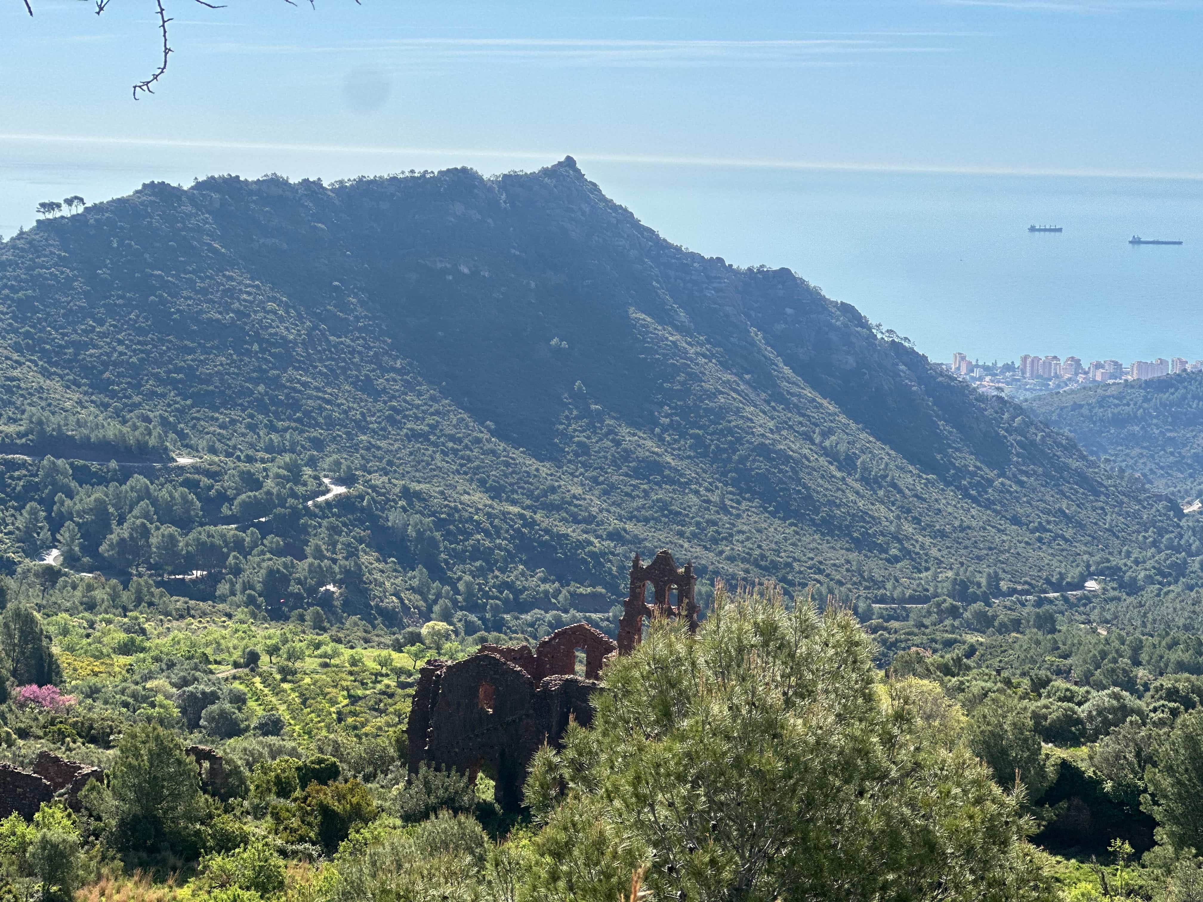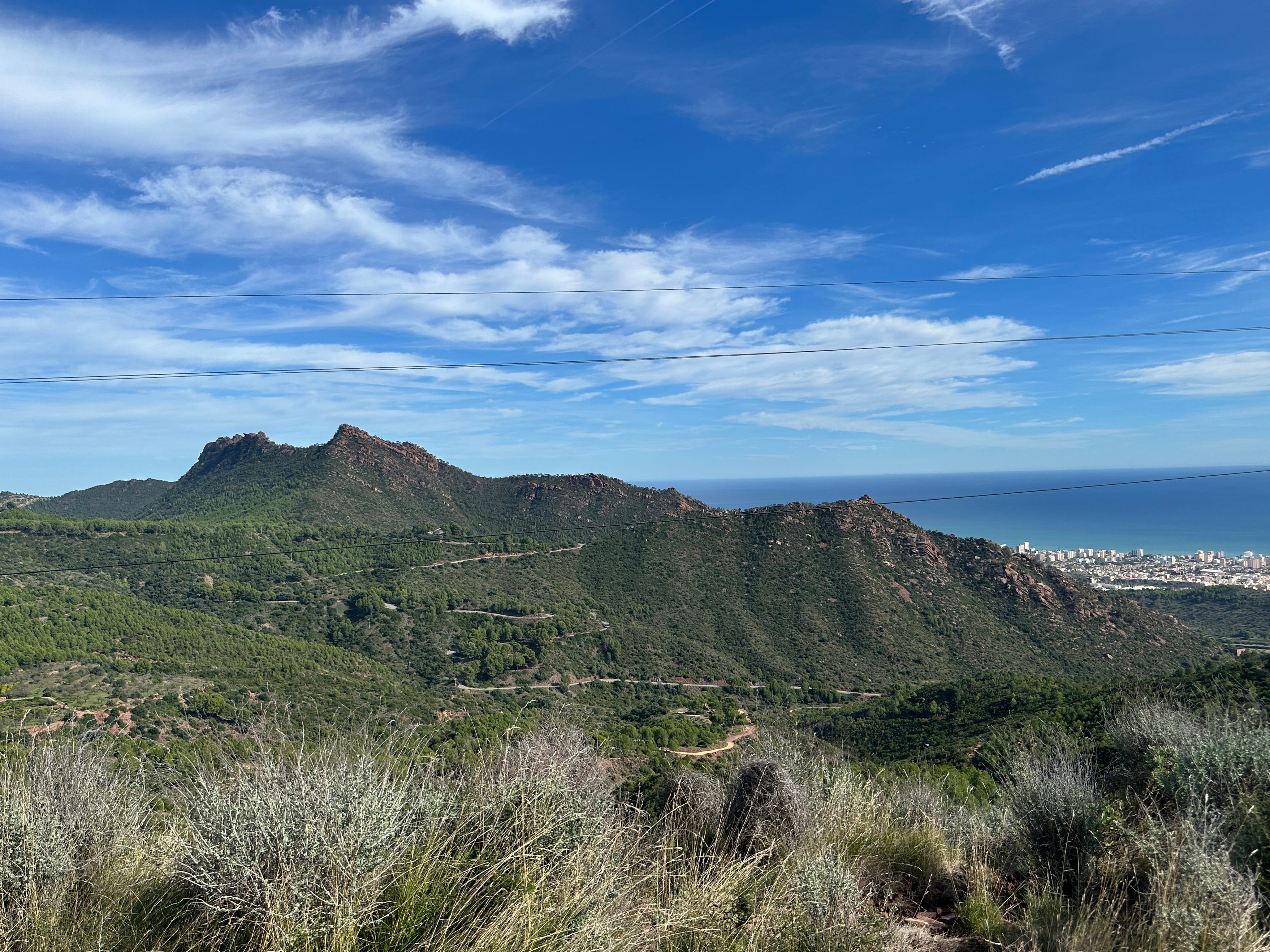 We head straight into the Desierto de las Palmas Natural Park — not a desert at all, but a dramatic landscape of pine-covered hills and rocky outcrops rising directly behind Benicàssim. We wind up through the park before beginning a satisfying descent back to sea level. The return leg follows the Via Verde, a former railway line converted into a dedicated cycling and walking path running directly alongside the Mediterranean. It's one of those stretches where you simply can't help but stop and take in the view.