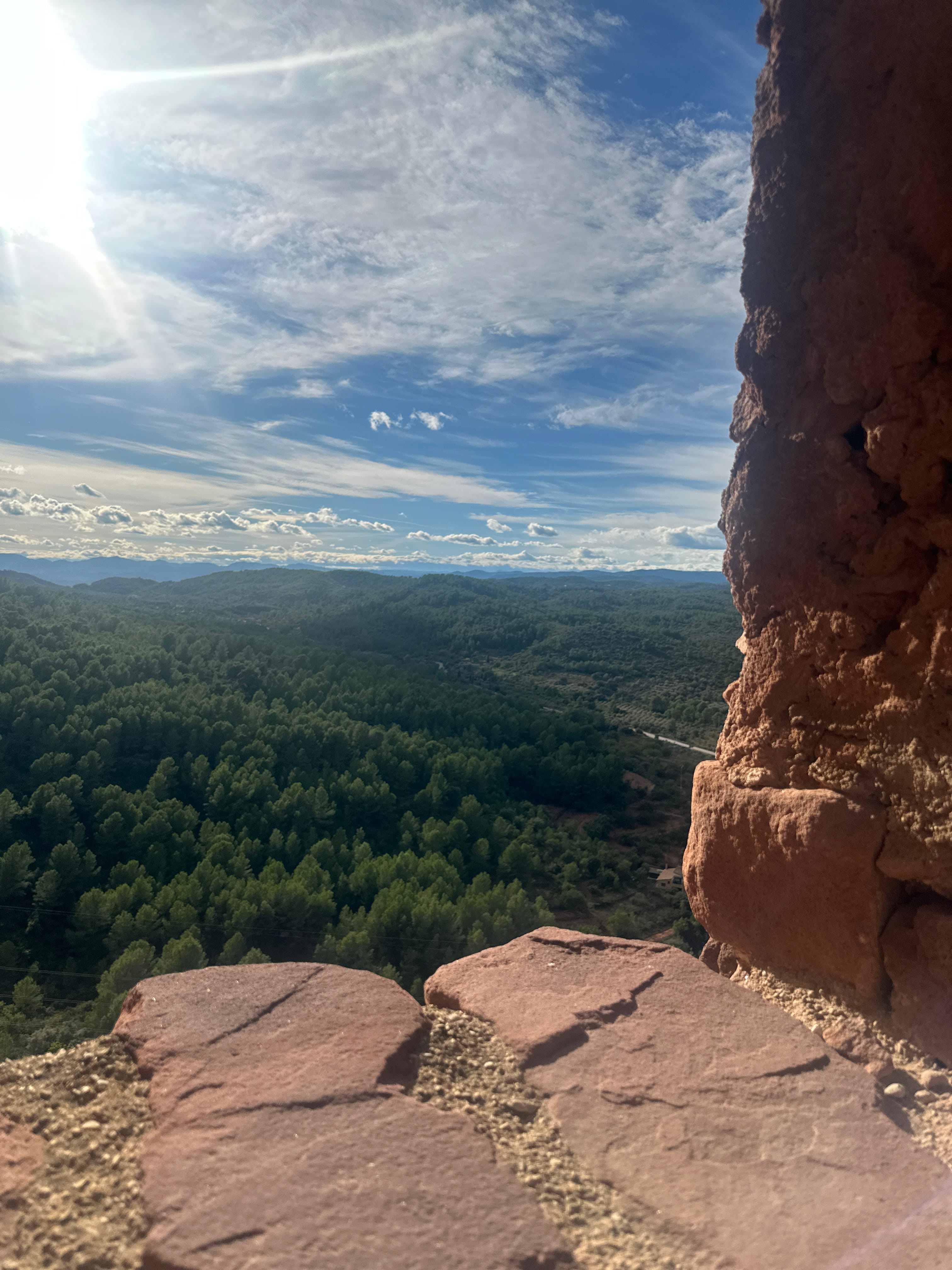 After breakfast — fresh-squeezed orange juice, local honey, yoghurt and David's homemade pan con tomate — we set off on a flatter start, skirting the edge of the Desierto de las Palmas before a steady climb into the interior. Our destination is Villafamés — officially one of the Most Beautiful Villages in Spain, and easy to see why. This medieval hilltop village, with its labyrinthine cobbled streets, whitewashed houses and the extraordinary Roca Grossa — a 2,000-tonne red rock that appears to have landed perfectly in the middle of the old town — is one of those places that stays with you. At the top, the ruins of an Arab-origin castle offer panoramic views stretching across the entire La Plana region to the Castellón coastline and the Mediterranean beyond.